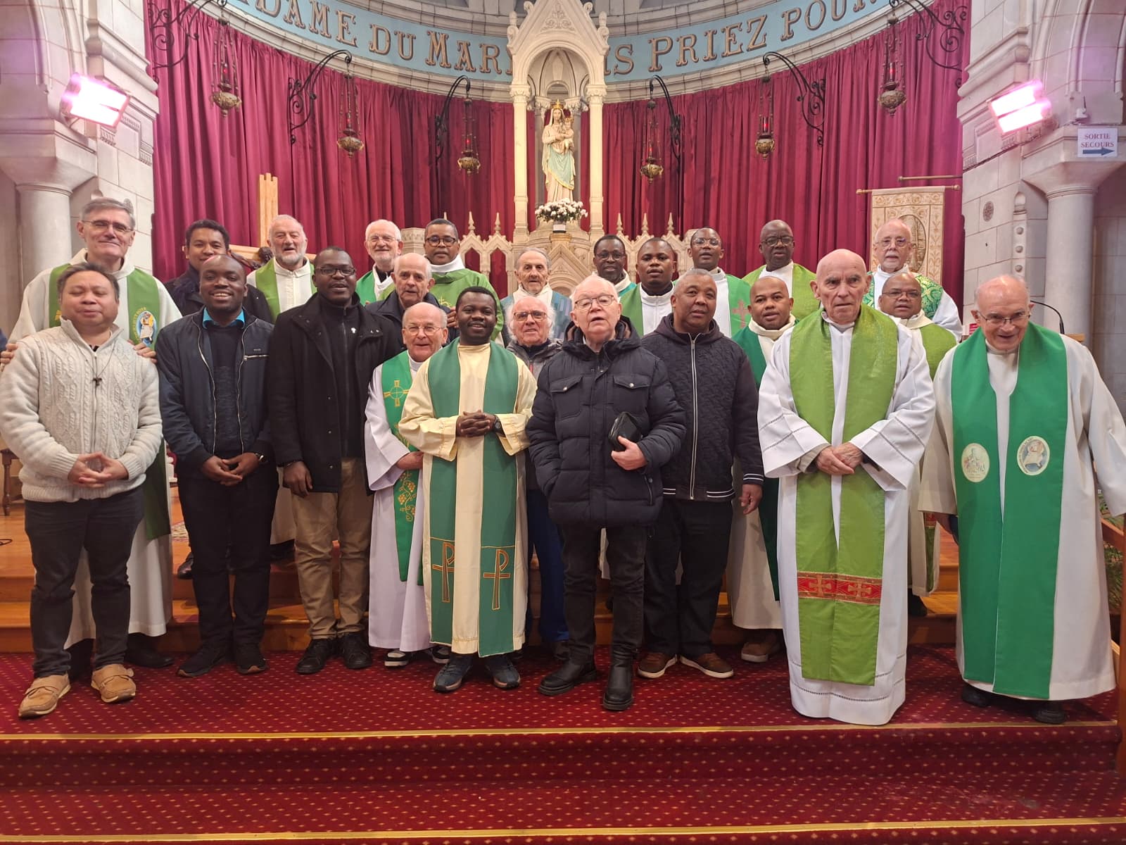 Sous la direction du Père Jean Marie, le groupe était divisé en quatre sous-groupes pour travailler sur trois questions : 1. En regardant le chemin missionnaire en France jusqu’à aujourd’hui, quelles sont mes attentes et mes frustrations ? 2. Qu’est-ce qui nous aide aujourd’hui à vivre comme « Nous » et qu’est-ce qui rend ce « nous » difficile ? 3. Quelles questions ou quels sujets la Vice-Province ne peut-elle plus remettre plus tard ? Après un temps de pause et la mise en commun des groupes, nous avons eu l’eucharistie présidée par le père Paulin. Son homélie était centrée sur la question : Comment vivre en disciples missionnaires ? Il a dit que les disciples dans la barque avec Jésus formaient un seul corps, une seule communauté. C’est l’image de notre entité, de notre vice-province. Dans l’après-midi, le Père Robert a animé la prière mariale au sanctuaire, puis il y a eu un moment de partage d’informations des différentes communautés.
